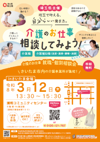 | 就職イベント情報 | 💡【埼玉県主催】「介護のお仕事 就職・個別相談会(さいたま会場)」に参加します! |