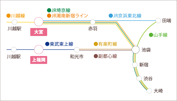 電車の場合 | ●JR埼京線・湘南新宿ラインで大宮駅西口下車→西武バス「ららぽーと富士見行」、「馬宮団地行」または「所沢駅東口行」で「治水橋堤防」下車、徒歩3分 ●JR埼京線指扇駅よりタクシーにて10分 |